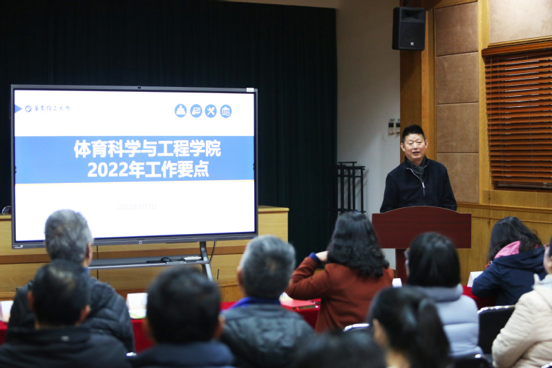 随后,院长王跃从政策背景、现有基础、未来发展等方面综合分析了体育学院发展面临的机遇和挑战,并对本年度重点工作进行了详细解读和部署。2022年,体育学院将围绕筹备运动训练本科专业和体育学一级学科、备战世界大学生运动会、加强校园体育文化建设等重点内容推进工作。