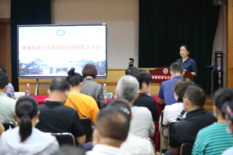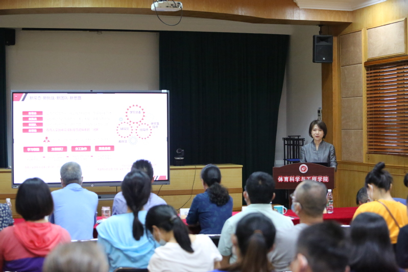 接着,学院党委副书记吴婷从新常态-新挑战-新团队-新思路出发,汇报了就业、返校、搬迁、迎新和献礼70周年校庆,营造爱校荣校的育人氛围,做好“以体育德、寓德于体”的人才培养模式,做好“以体育人、以文化人”的校园文化营造等方面的工作情况。