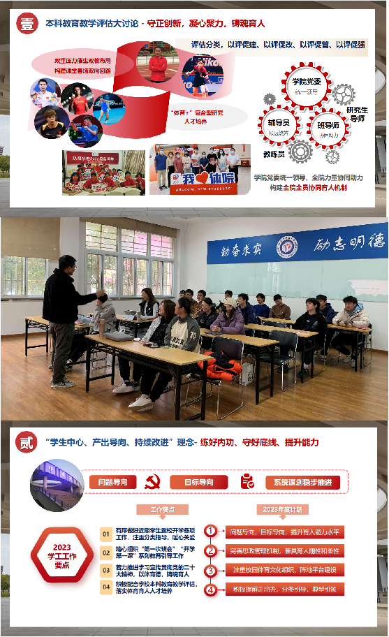 通过专题大讨论,结合本科教育教学审核评估自查工作,体育学院不断深入调研,查找不足,总结经验,在此基础上进一步梳理完善学院相关规章制度和工作机制,切实落实人才培养的中心地位,不断提升人才培养质量,助力学校“双一流”建设。