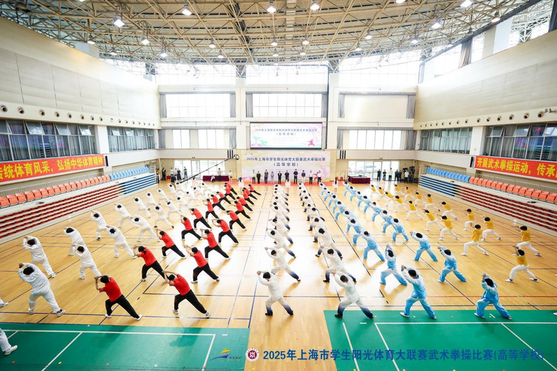 5月24日上午,2025年上海市阳光体育大联赛武术拳操竞赛在上海中医药大学体育馆盛大举行。来自太阳集团、华东政法大学、上海师范大学等16所本科及高职院校的武术健儿齐聚一堂,以武会友。本次竞赛由上海市教育委员会、上海市体育局、共青团上海市委员会主办,上海市学生活动管理中心、上海中医药大学承办,上海市教委体卫艺科处、上海市学生活动管理中心及相关部门负责人莅临现场。