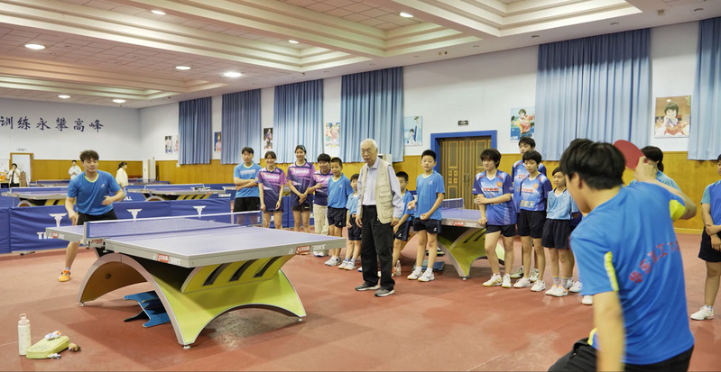 张燮林从童年时期讲起,深情回忆了他与乒乓球运动结下的深厚缘分,将那段艰难困苦但斗志昂扬的峥嵘岁月娓娓道来。作为“乒乓外交”的主要亲历者之一,张燮林表示有幸见证了“小球转大球”的历史时刻,深刻感悟到只有国家自身的强大才能使我们屹立于世界民族之林。“我是党和国家培养的一批新的运动员,第一次出国比赛,我很注意形象,因为我知道自己代表的是新中国,要为国家争光。”张燮林先生强烈的家国情怀与民族荣誉感触动着现场师生和年轻队员,他勉励大家要珍惜来之不易的训练条件,树立矢志不渝的报国志向,勤学苦练、精湛球技,打好文化球,为祖国和人民赢得更多荣誉。