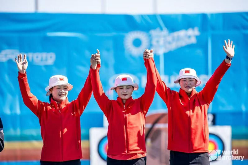 在2025年射箭世界杯年度首站——美国奥本代尔站比赛中,体育学院运动训练专业2024级本科生朱静怡与国家队队友默契配合、表现惊艳,先后力克法国、西班牙等国家代表队,最终在反曲弓女子团体决赛中战胜东道主美国队,斩获中国代表团本届赛事首金。