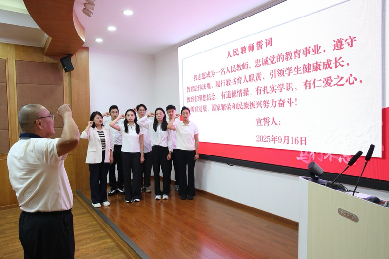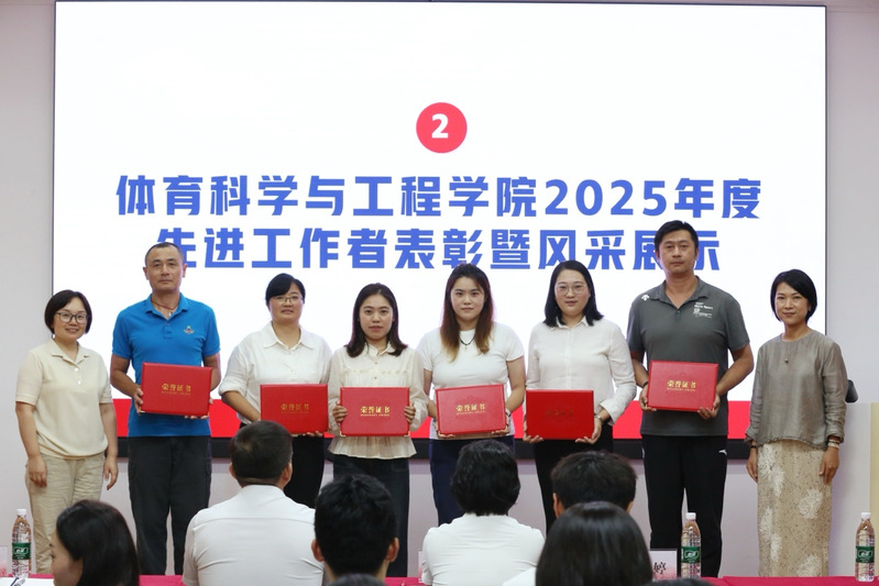 会议还对获得体育学院2025年度“先进工作者”荣誉称号的教师进行了表彰,同时举办了新教师入职仪式,学院老教师周光云带领全体新进教师庄严宣誓,誓做一名光荣的人民教师。