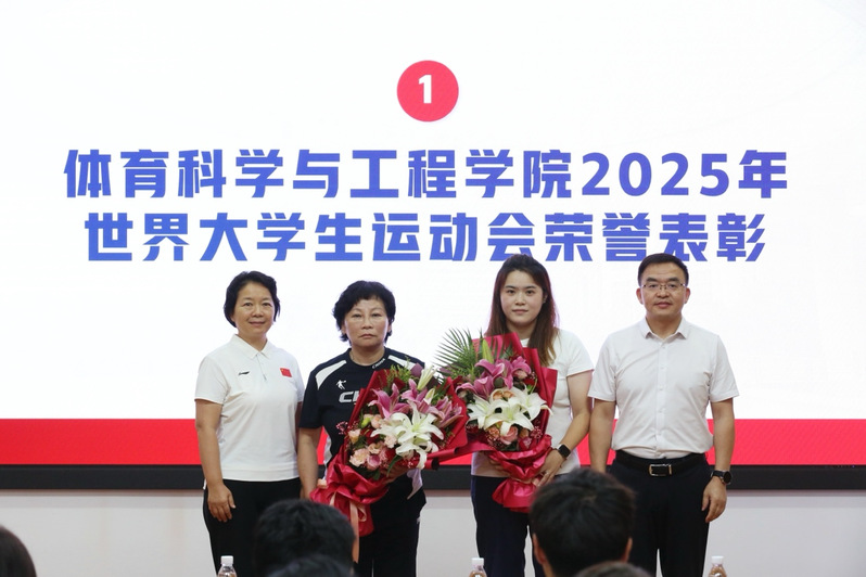 会上举办了2025年世界大学生运动会荣誉表彰仪式,徐文方、叶心明分别向臧玉瑛、马越斐送上鲜花表示祝贺。今年7月,由体育学院教师臧玉瑛、马越斐担任教练,韩菲儿、王晓彤、杨屹韵、赵尚4位华理学子组成的中国大学生乒乓球女队,在第32届德国世界大学生运动会中不畏强敌、克服困难,最终夺得2金3银2铜的优异战绩,为国家争得荣誉、为学校赢得喝彩。
