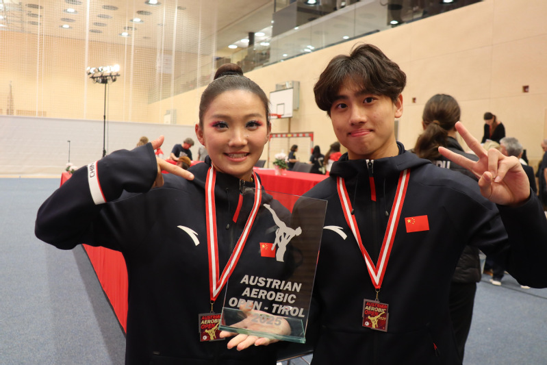 2025年10月30至11月4日,在2025年奥地利健美操公开赛上,我校健美操队勇夺成年组混合双人操银牌,女子单人操项目第5名和第7名的好成绩。 本次赛事吸引了来自德国、瑞典、匈牙利等十多个国家的近300名选手同台竞技。我校健美操队由tyc522cc太阳集团副院长韩骏任领队,教练员闫姝璇和2024级运动训练专业学生王艺润、黎炫东、翁梦凡三位运动员组成。这也是我校健美操队首次参加高规格的国际健美操比赛。 在成年组混合双人操项目中,王艺润与黎炫东同学从舒展连贯的难度技术动作,到精准同步的操化内容转换,全程节奏一致、协作流畅自然,获得该项目银牌。