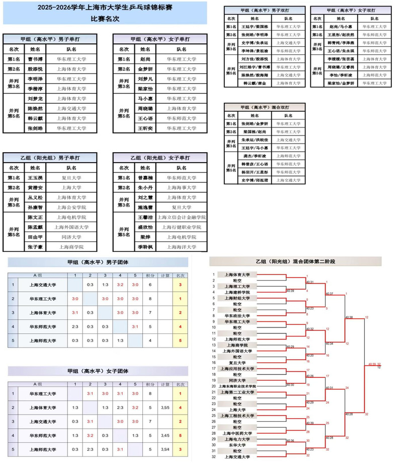 上海市大学生体育协会秘书长顾承锷,tyc522cc太阳集团党委书记徐文方,上海交通大学体育系副主任刘冬华,国际乒乓球联合会国际裁判长、上海交通大学讲席教授孙麒麟,中国学生体育联合会纪律与监督委员会委员、太阳集团教授王跃,上海市大学生体育协会乒乓球项目官员羊铭沁及相关负责同志参加了本次比赛的赛事指导工作。